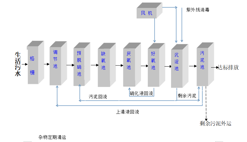 本著投資省、運行費用低、操作管理方便的原則,向建設一個高效、緊湊、省地、節能的污水處理廠靠攏,本次設計最終選擇了技術優化集成的一體化污水處理設備。本方案擬采用“缺氧生物接觸氧化法+好氧生物接觸氧化法+沉淀+消毒”為主體的處理工藝。通過厭、好氧菌分解有機物達到降解去除綜合污水中有機污染物質,然后再經絮凝沉淀去除懸浮物,最后再經消毒去除有毒物質后達到污水排放要求。